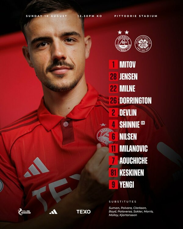 No cup final motm. Dorrington to left side? Could be disastrous. Would play Milne there instead. Edit: I'm assuming a 4-2-3-1 with Shinnie and Nielsen in midfield. Hope to christ it isn't Jensen at left back.