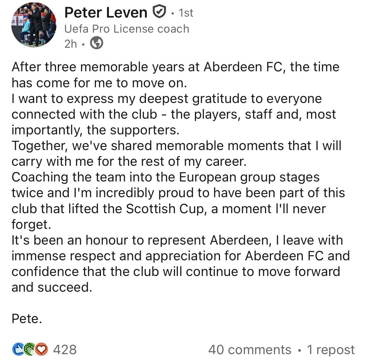 Mixed feelings, very thankful he took on the role twice to get us out of the shit, and by all accounts sounded like he had a big role in the SC win. How much say he had over the final reign, who knows, but it wasn’t working and something needed to change unfortunately. Wish him all the best.