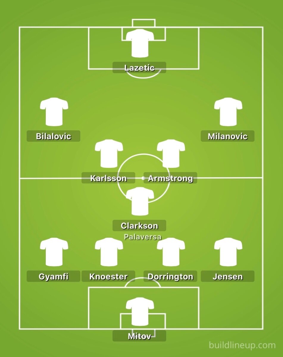 Almost same team that finished the United game, with a few changes. If Clarkson fit, him in for Nilsen, simply because he's a better player. If not, I would give the nod to Palaversa, more just because I don't think Nilsen's histrionics are helpful. Karlsson central (where he looked okay at Tannadice), another chance for Milanovic, Lazetic (if fit) to see if he can be more involved than Nisbet. The good news is there are options here for Thelin and so many other things to try before we give up.
