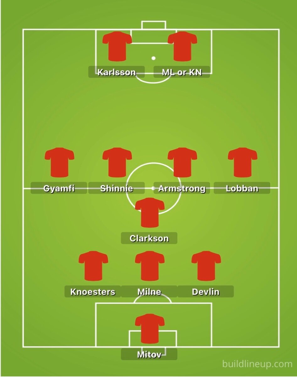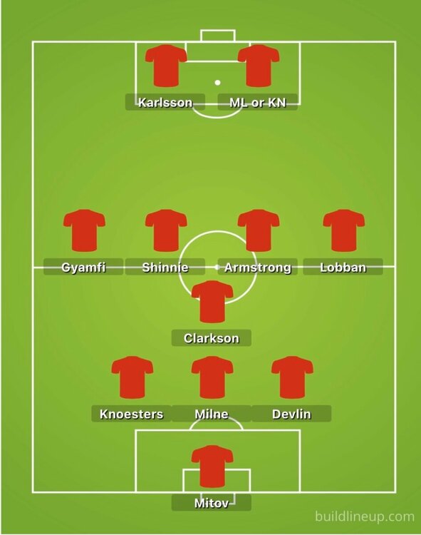 This is very much the Hibs formation. Clarkson in deep allowing Armstrong and Shinnie to push further forward than the graphic shows, and it would allow our midfield to have an extra man to Hearts' two. Lazetic or Nisbet to partner Karlsson. I'm not sure which one works best or if Karlsson would even work in a front two. Looking forward to seeing Lobban v Milne on that side of the pitch. Shankland apparently hasn't travelled with the Hearts squad, Ague and Baningime also out. Cammy Devlin - arguably Hearts' best player this season - picked up a knock so will not be 100%. Halkett suspended. Despite their good start, the game is there to be won. Good time to be playing them.