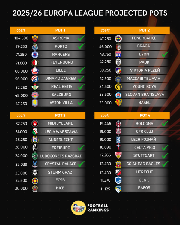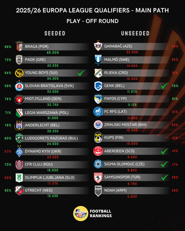 This is the updated list of possible play-off opponents. A lot of it is based on projections though, and not all of it on the seeded team winning, more the 'favourites', so it's only a rough idea at the moment. There is a small chance enough seeded teams could be knocked out, meaning Aberdeen could be seeded. Likewise, if Aberdeen did make the group stage, they would more than likely be in pot 4. The new format means we would play two teams from each of the four pots, with four home games and four away. The top 8 make the last 16. The next 8 are seeded for the knockout play-offs, and the following eight are unseeded. Just need to avoid finishing in the bottom 12 to advance. Going by last year's table, 11 was enough to progress, and one team on 10 points made it through (A post-Jimmy Thelin Elfsborg also got 10 points, but missed out on goal difference).