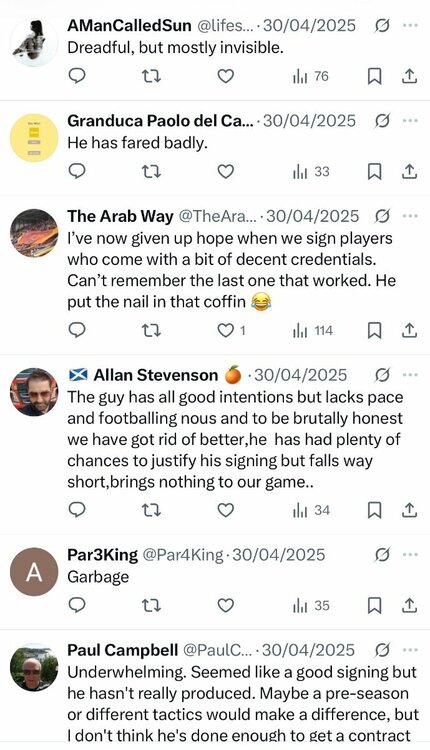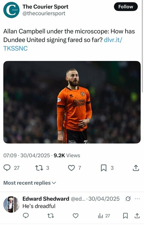 Because I was replying to a comment that said we've signed "spineless foreign shite", and you entered the discussion listing Scottish players. So that's the relevance, unless you're changing the subject. But we're not though, are we? We had seven UK & Irish based players involved today. We lost to a team who played only six. The champions will likely start the cup final with just two Scots in their team. Hibs, who will likely finish third, started only four Scots yesterday (one of which is an Australian international), they're hardly a team full of home-born players either. Six of our starting line-up today have played in Scotland before this season and should meet your 'knowledge of Scottish football' criteria. Three of the subs meet that too. We're also not in July, we're in May. Thelin and his back room team know all about Rangers having played them four times. So what's your point here, that Scottish or UK signings would be better? You've just cherry picked some names that may not be good enough, in order to make what point? I could list UK and Irish players who aren't good enough either. This is the guy you've been championing isn't it? That we absolutely had to sign? Dundee United signed him, and he's been extremely poor. Here's the views of Dundee United fans... Sigh. No-one is offended.