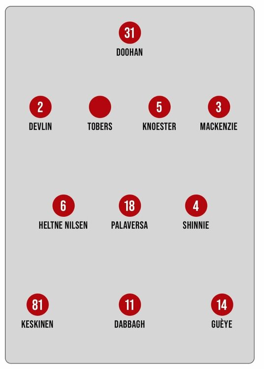 I have a bet on Okkels to score the first goal, so of course it was ruled out. Nisbet and Gueye appear to be the link-up men with Topi and Okkels the guys expected to score. Would like to see Mackenzie and Jensen get the ball in the final third though. Edit: Devlin and Jensen, since Mackenzie has just gone off.