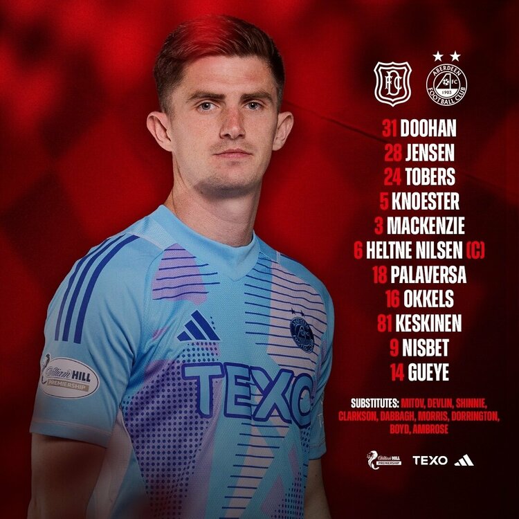 Agree with @RicoS321, I'd probably give Mitov another week, and I don't think Doohan has done too badly. I think it'll be a battle; after two 6-0 defeats I don't think Dundee will be planning to knock it about and play pretty football. I also wouldn't be surprised to see Dabbagh start. Thelin likes to throw a new signing in from the start I've noticed. I'd start Palaversa to sit deep and spray the long passes. Nilsen and Shinnie to go disrupt Dundee's midfield ahead of him. Gueye and Keskinen both different players, but both capable of keeping Dundee's defence occupied in a way Okkels hasn't quite managed yet. 6-0 Aberdeen. Dabbagh with four goals, Keskinen one, and Nisbet one off the bench. NB: Not sure why Tobers doesn't have a number in the graphic, will raise it with the club next week.