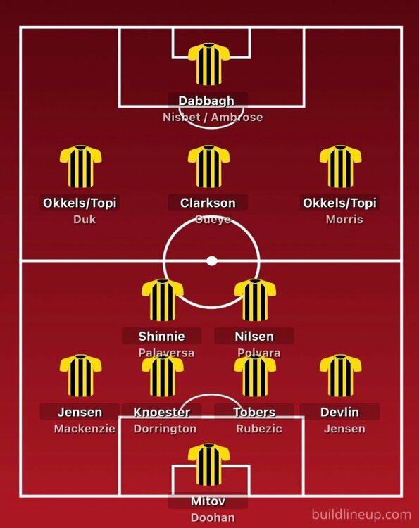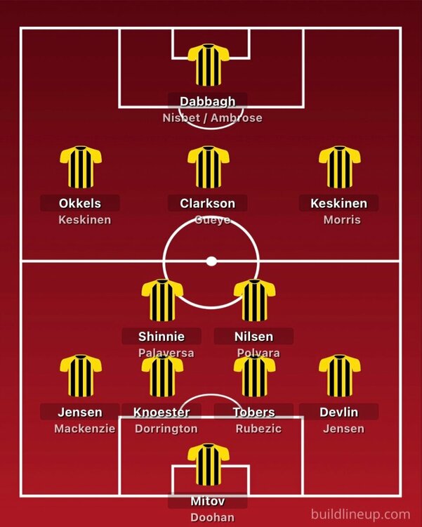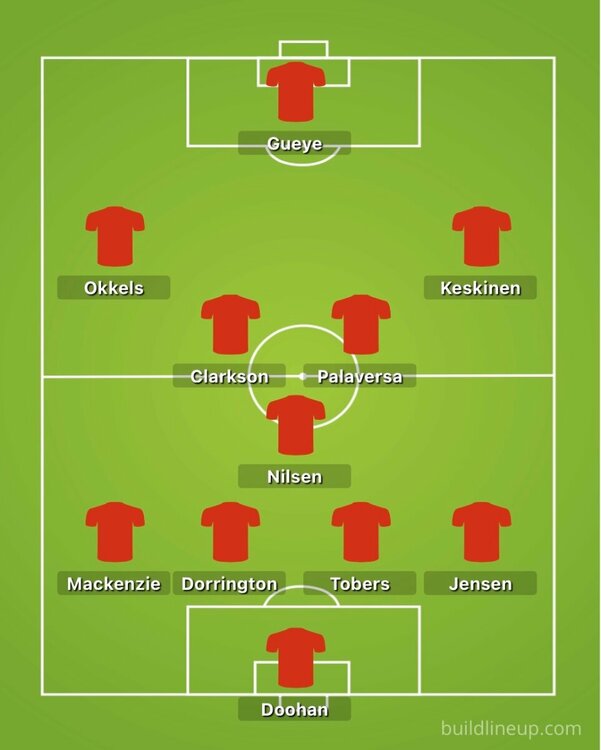 Despite all our signings we still look unbalanced up front. We have two guys wanting to play on the left, but long term Thelin clearly wants Okkels and Keskinen to be his first picks and this is the game to hopefully get them firing. I think Keskinen is just going to have to try and grow into the role of playing off the right. I'd rest Shinnie and Devlin. Dorrington to start and Knoester to get some minutes off the bench. Gueye up front but essentially dropping deep and creating space for Okkels and Keskinen, while being handy enough to be in the box to get on any corners. I'd like to see Clarkson and Palaversa push forward with Nilsen mopping up behind them. We won't line-up like this of course, I expect Thelin will stick with 4-2-3-1, so probably Nisbet in at the expense of a midfielder.