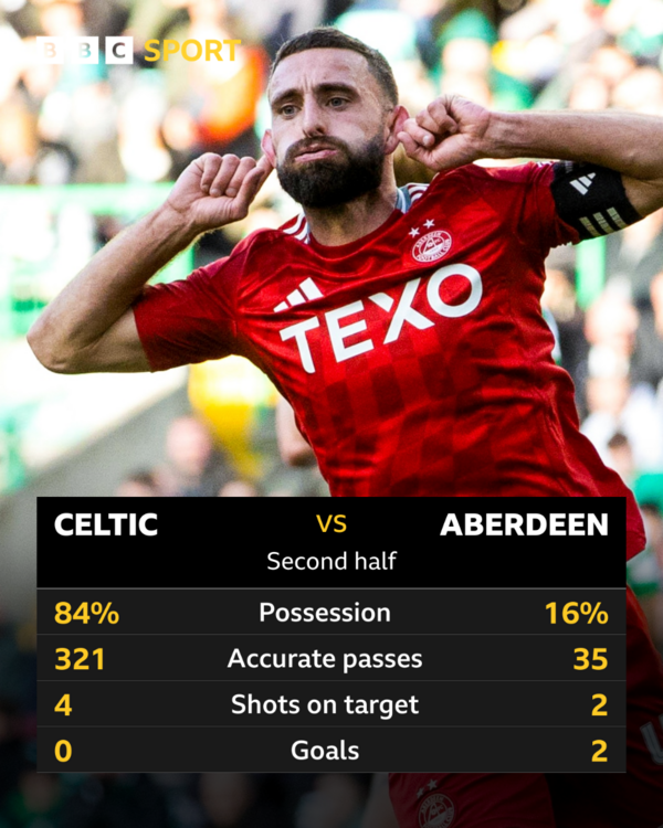 First time since March 2013 I think since Celtic have let a two-goal lead slip. And it's all down to our manager. First half: We made so many errors and were fortunate Celtic didn't punish us more. Rubezic dragged out of position, Molloy poor again (third game in a row), Nilsen looked a little overwhelmed and was careless both in and out of possession - giving the ball away and coughing up cheap free-kicks. Everyone on Sportsound were saying "Clarkson off for Palaversa, shore up the midfield and make Aberdeen more defensively solid." But instead Thelin was only thinking about how Celtic's high line was there to be exploited. The subs worked. Second half, as the graphic I posted showed, we actually had less possession, but we were more dangerous. We had a manager brave enough to give up the ball in return for having three to four players able to race forward when Celtic lost it. We had Celtic spooked, and really they only regained their composure for the last 20 minutes. Very few teams outside the sides they face in the Champions League will do that to them.