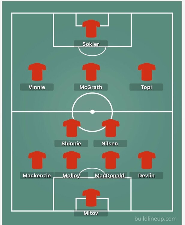 I think Morris and Rubezic will both start, but I'd go with Vinnie and MacDonald. Would be good to see some of Palaversa. Nisbet looking likely to sign before Sunday too, expect him to be on the bench.
