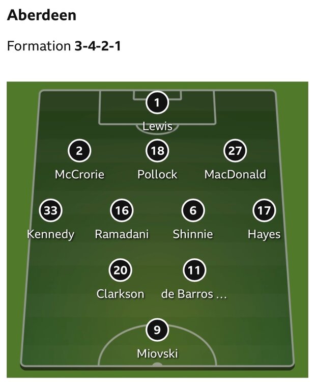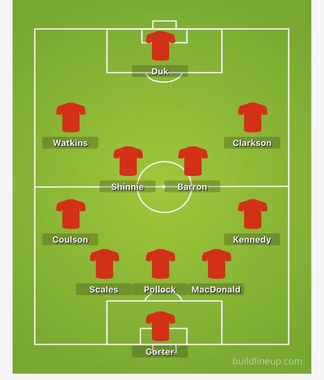 Would imagine Robson will stick with three at the back, on account McCrorie can't play RB, Kennedy struggled there v St Mirren, and Richardson wasn't even on the bench last night. Would play Duk through the middle as opposed to wide where he was last night, bring Watkins in (if we were turning down advances for him on transfer deadline day then surely he'll be used more in the second half of the season), Coulson ahead of Hayes to freshen it up, and Barron ahead of Ramadani. And Scales is back from suspension - Mackenzie wasn't in squad last night either so presume he has a knock. Gorter in if his work permit sorted by the weekend. All things considered, on paper that's not a bad line-up.